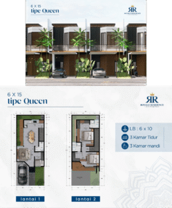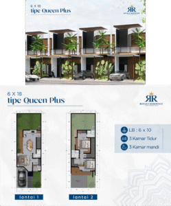 Apakah Anda ingin ruang lebih untuk keluarga yang berkembang? Maka, Type Queen Plus (6×18 m, 2 lantai) hadir dengan 3 kamar tidur, 3 kamar mandi, dan area belakang yang lapang.