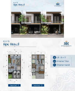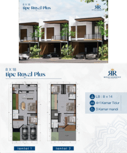 Type Royal Plus (8×18 m, 2 lantai) adalah puncak kemewahan Royale Residence. Karena memiliki 5 kamar tidur dan 3 kamar mandi, maka tipe ini sangat cocok untuk keluarga besar atau mereka yang ingin ruang hidup luas dan eksklusif.